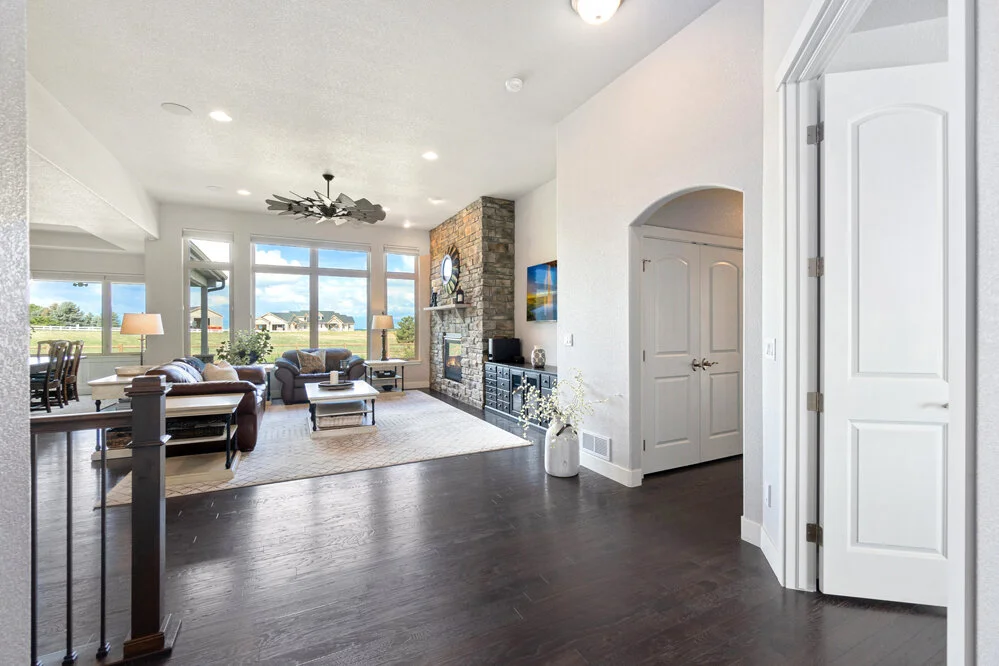 Gorgeous Living Room w/ Floor to Ceiling Stone Fireplace